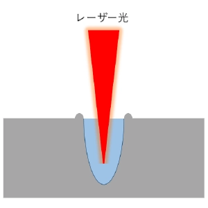 キーホール溶接は、エネルギー密度の高いレーザー光で母材を溶かして溶接します。そのため、レーザー照射部表面で蒸発が起こりくぼみが形成されます。このくぼみが深くなってできる空洞を「キーホール」と呼び、より溶け込みの深い溶接が可能となります。