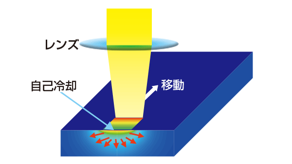 レーザー光が当たった表面だけが瞬時に1000℃付近まで加熱し、自己冷却による急冷で焼入します。ワークに与える熱影響が最適化され、熱歪みが低減されます。 |