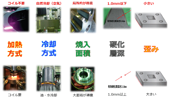 | 焼入れ面積 | 極小範囲の焼入れが得意 | 大面積の部分焼入れが可能 | 表面全体が硬化 | 表面全体が硬化 | |