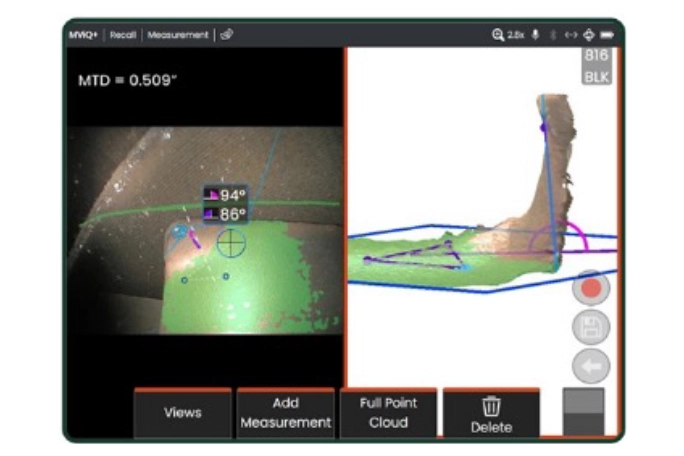 単一の光学チップを使用した3Dステレオ測定や、特許取得済みの3Dフェーズ(3DPM)測定技術を採用しています。高度なキャリブレーションとアルゴリズムにより、ターゲット表面の高精細な3D点群モデル(ポイントクラウド)を生成。長さ、深さ、面積、角度などを自由な角度からリアルタイムで正確に測定します。 利点: プローブの動きの影響を受けにくく、従来の計測が難しかった光沢面や複雑な凹凸面でも高精度な測定が可能です。欠陥の寸法や深刻度を正確に数値化し3Dで視覚化できるため、部品の継続使用や交換の判断 (合否判定)を確信を持って行うことができ、過剰メンテナンスや予期せぬ故障を未然に防ぎます。 - InspectionWorks連携とMDIによるデータ管理・レポート作成の大幅な効率化