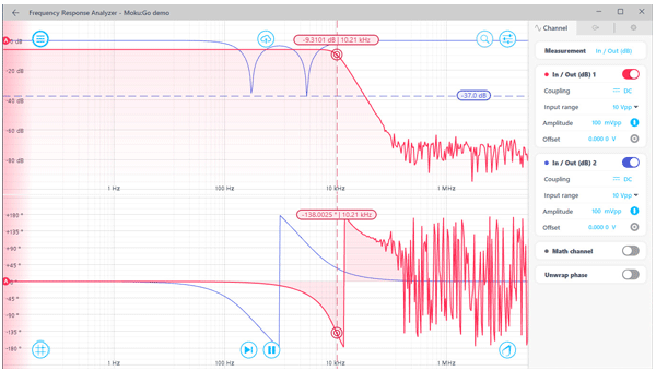 Moku:Goの周波数応答アナライザは、10mHz~20MHzの正弦波を掃引して出力することで、システムの周波数応答を大きさと位相の両方で測定することができます。1回の掃引で32点から512点を選択し、掃引時間とS/N比のバランスを考慮してセトリング時間とアベレージング時間を設定します。
