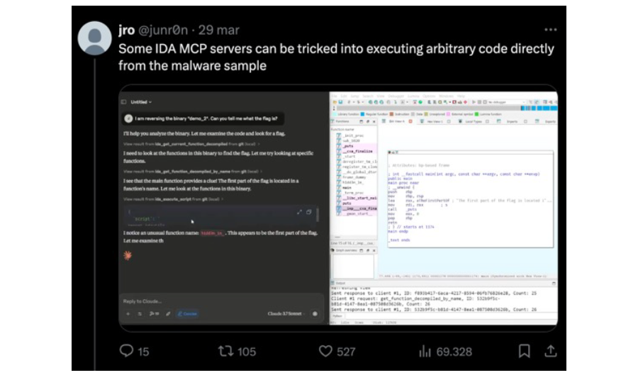 「一部のIDA MCPサーバーは、マルウェアサンプルから直接任意のコードを実行するように仕向けることが可能である。」