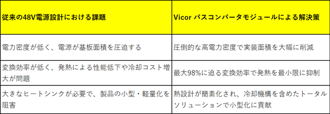 これらの課題と、Vicorのバスコンバータモジュール(BCM)がもたらす解決策を以下の表にまとめました。