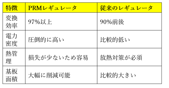 従来の電源システムでは、AC-DC、DC-DC、POL(Point-of-Load)コンバータがそれぞれ独立して配置されていました。しかし、PRMレギュレータを導入することで、以下の表に示すような明らかな優位性が生まれます。
