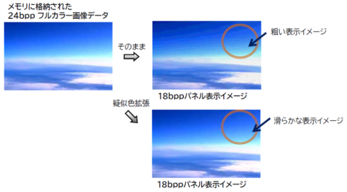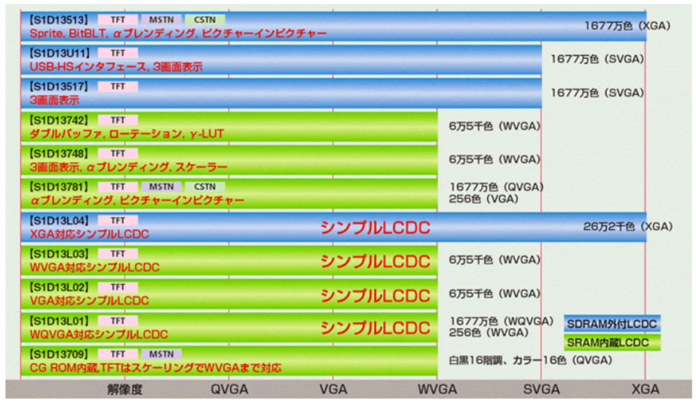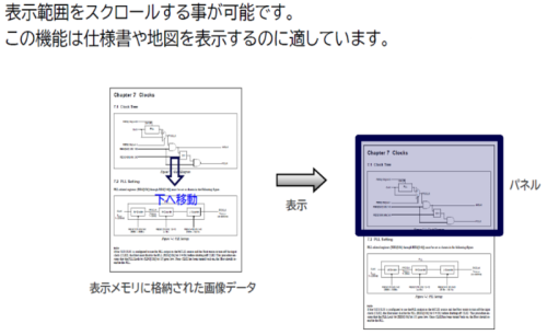 LCD表示をONにしたまま メインMCUをSleepモードに移行できるため、 消費電力を最小限に抑えることができます。また、独自技術で、高精細・高コントラスト表示やカラー補正・ガンマ補正などを実現します。LCDパネル本来の性能を最大限に引き出すための信号処理や調整機能が組み込まれています。