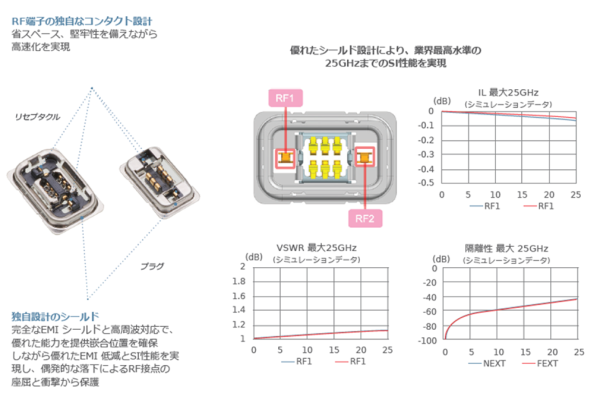 両シリーズは、小型民生機器で広く使用されている多芯の小型BtoB(基板対基板)コネクタの外形がベースの製品です。そのため一般的な同軸構造をとっていませんが、綿密なシールド設計や伝送評価により、小型・高周波と複数のRF信号経路を1コネクタに盛り込むことに成功しました。
