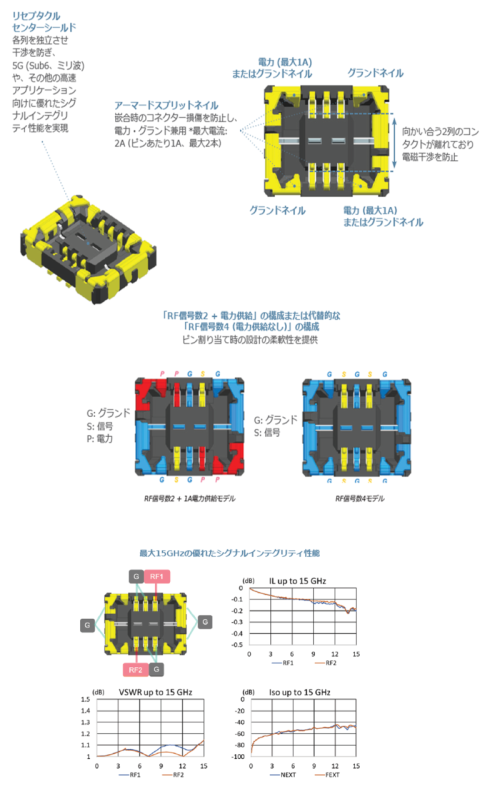 両シリーズは、小型民生機器で広く使用されている多芯の小型BtoB(基板対基板)コネクタの外形がベースの製品です。そのため一般的な同軸構造をとっていませんが、綿密なシールド設計や伝送評価により、小型・高周波と複数のRF信号経路を1コネクタに盛り込むことに成功した製品です。