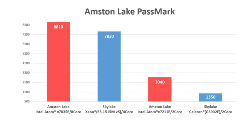 最新のAmston Lake世代のIntel Atom®プロセッサーは、下位クラスのモデルでありながら、従来のSkylake世代Celeron®を最大125%上回る性能を発揮し、一部のベンチマークにおいては、Xeon®プロセッサーに匹敵するパフォーマンスを実現しています。
