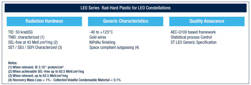 プラスチック・パッケージで提供される耐放射線製品であるLEOシリーズは、同社の40年にわたる航空宇宙分野におけるノウハウと車載用AEC-Q100認定の製造ラインを最大限に活用しています。これにより、コスト効率や耐放射線性、品質保証、出荷数を独自に組み合わせて提供しています。また、コンステレーションのニーズに合わせて、認定や製造、スクリーニング、品質保証、および物流において、専用のプロセスが用意されています。