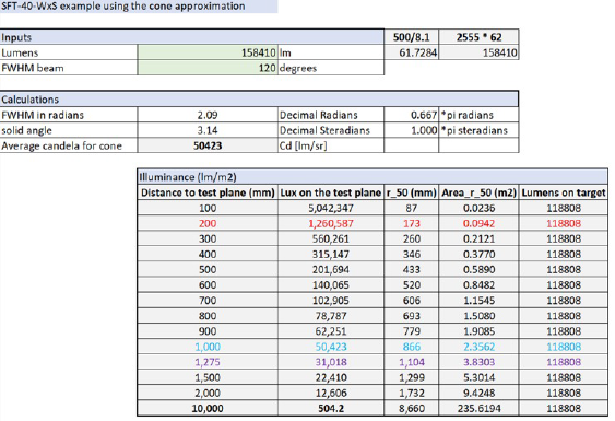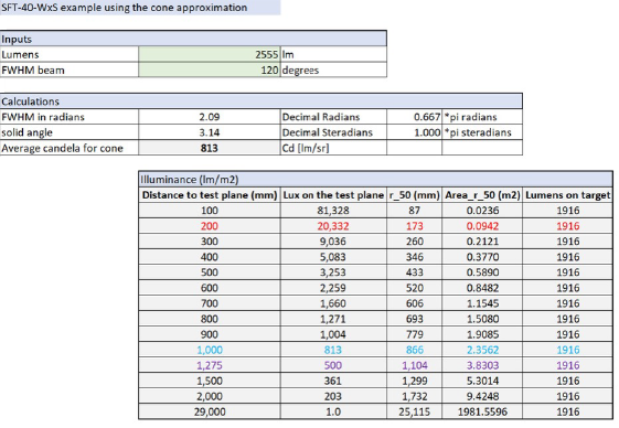 ここで「LEDカンデラ」は、LEDのFWHMビーム角度とルーメン出力が与えられた場合、距離に依存しない定数です。厳密に言えば、単位変換のための単位定数が存在するはずですが、ここでは省略します。この議論では測光単位を使用していますが、これらの手法は放射測定単位にも適用できます。