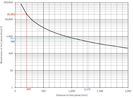他の 2 つの距離は、IEC 62778 および IEC/EN 62471 のテストに関連しています。200 mm は IEC 62778 の標準テスト距離です。1,275 mm は、LED が 500 ルクスの照度を持つ距離です (この特定の条件セットの場合)。これは、IEC/EN 62471 の「GLS」白色 LED のテスト条件です。