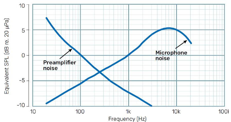 測定システムのダイナミックレンジの下限(ノイズフロア)は、マイクロホン自体のノイズとプリアンプが生成する電気ノイズの合計で決まります。プリアンプのノイズは、一般的に低周波数側で支配的になる傾向があり、超低レベル音響信号の測定精度に直結します。