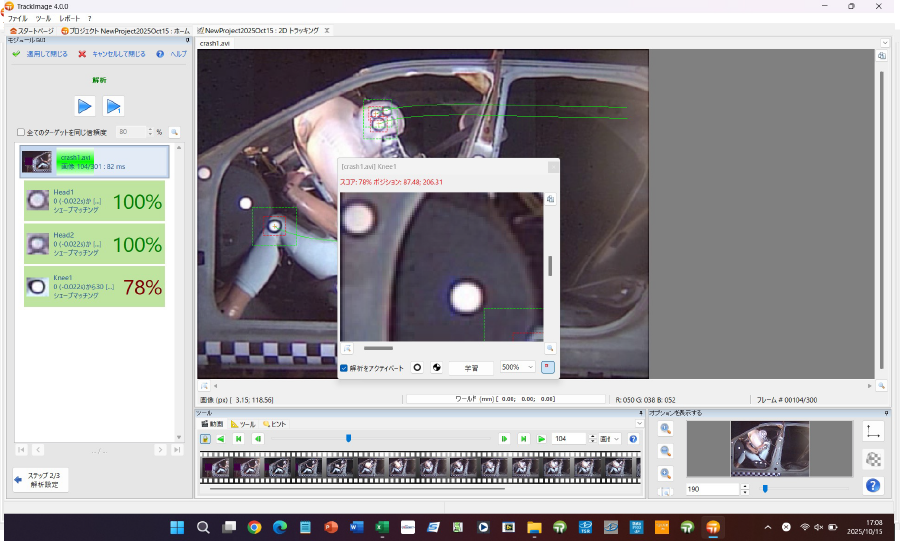 また、追跡点が回転したり、影などで、信頼度が下がった際、「学習」というボタンを押すことで、押した時点の追跡点を以後のフレームで追跡するという設定ができます。