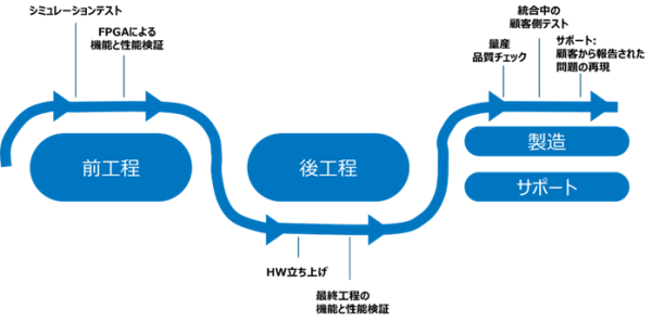 イーサネットは、今日のほぼすべての種類のネットワークで好まれる技術です。これらのネットワークは、スイッチ、ルーター、ネットワークインターフェースカード(NIC)などの主要コンポーネントをイーサネットケーブルで接続して構築されます。ネットワーク機器内部のコアASICと機器自体の両方の製品ライフサイクルを通じて、性能と信頼性を確保するために徹底的なテストが必要です。例として、図1はASICの製品ライフサイクルの各段階で実施される様々な種類のテストの概要を示しています。