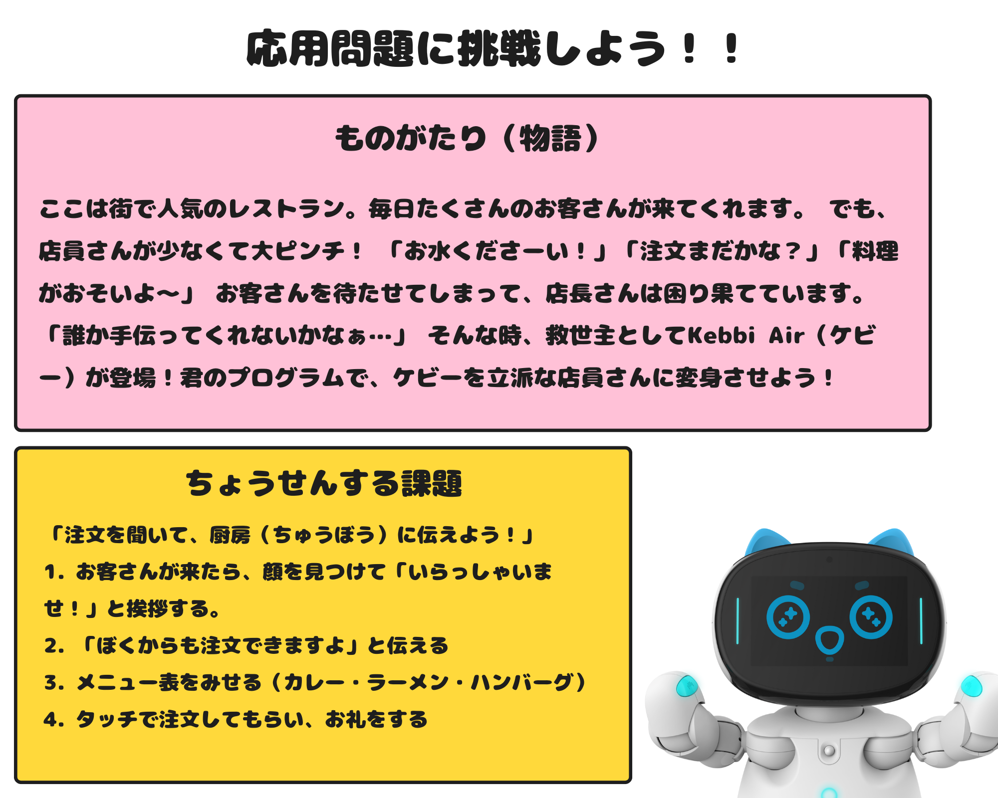 レストランの店員さんになろう:「いらっしゃいませ」と挨拶し、メニューを表示して注文をとるプログラムを作成。