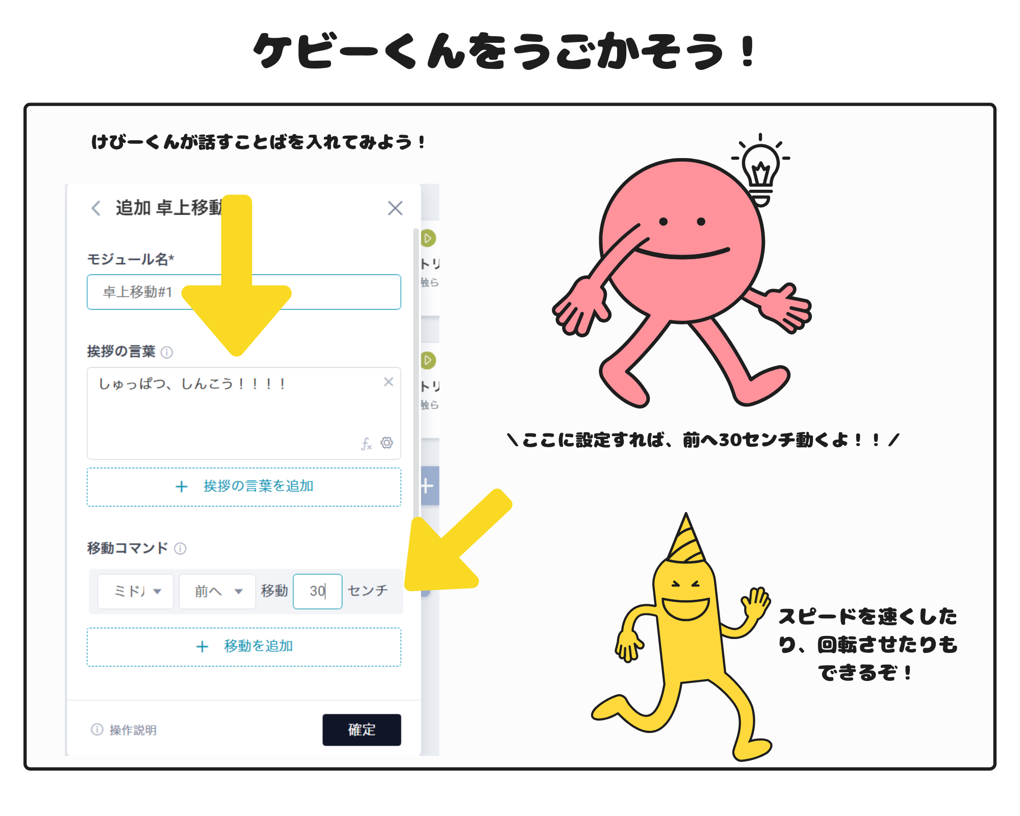 「顔を触ったら挨拶をする」、「お腹を触ったら前に30cm進む」といった、トリガー(きっかけ)とアクション(動作)の基本を学びました。