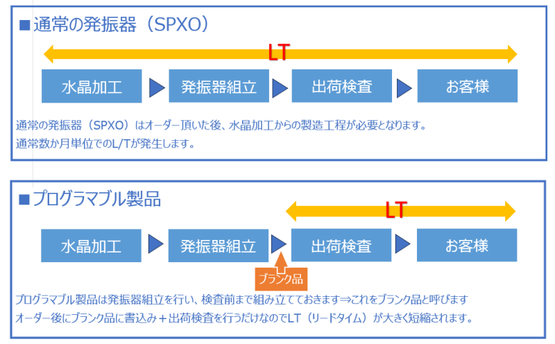 プログラマブル発振は、ブランク品にご希望の周波数を書き込むだけで出荷できるため、通常の発振器よりも短納期の対応が可能です。