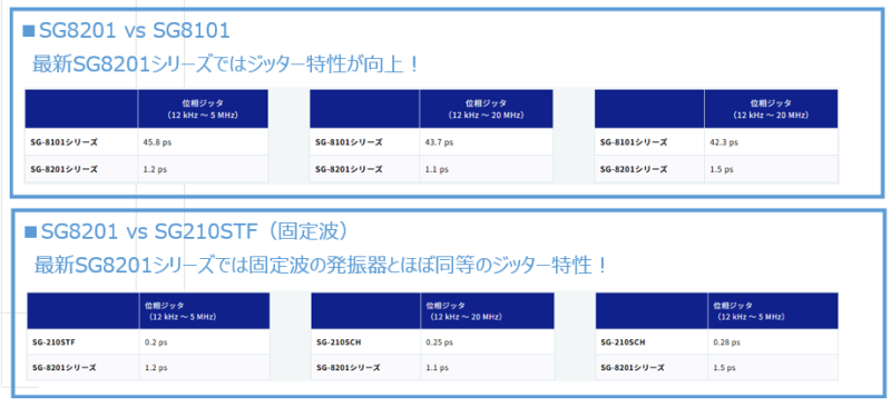 プログラマブル発振器はPLL回路が内蔵されておりますので、どうしてもジッター特性が特性的にネックとなっておりました。昨今の新シリーズ/SG8201シリーズでは、固定波発振器とほぼ同等のジッター特性まで性能が向上しております。従いまして今までジッター特性的にどうしても固定波しか使えなかったアプリケーションについてもプログラマブル発振器での評価や量産対応も可能です!