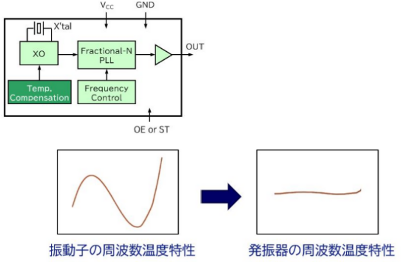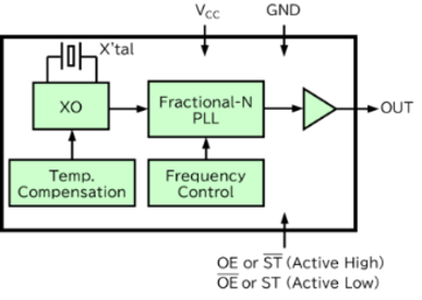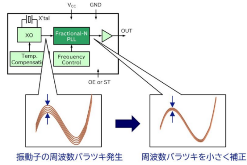 プログラマブル発振器(SG8201シリーズ)はFractional-N PLLによって、任意の周波数に10-6 (1 ppm) の精度で調整可能なので、振動子の周波数のばらつきがPLLで補正可能となり、周波数精度が高くなります。
