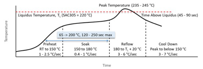 SMD部品のリフローはんだ付けには、はんだの種類、粒子径とフラックス、部品密度と回路基板の質量、はんだペーストの印刷詳細、使用するリフロー装置など、数多くの可変要素があります。すべてのアプリケーションをカバーする単一のソリューションを提供することは不可能です。Luminusでは、プロセス開発の出発点として、はんだペーストメーカーの指示に従うことを推奨しています。以下に、一連のベストプラクティスのガイドラインを示します。