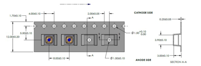 下図は、Luminus社製LEDコンポーネント用テープの寸法と、リール内での部品の向きの一例を示しています。業界標準である「カソードを(テープの)送り穴側に向ける」向きが採用されています。詳細については、各製品のデータシートをご参照ください。