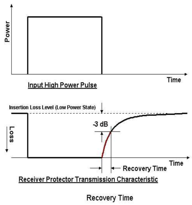 High Power StateからLow Power Stateへ遷移するのに要する時間です 。つまり、強力な送信パルスを出力した後、保護装置が元の「信号を遮断しない状態」に戻るまでにかかる時間のことです。一般的には静止時の挿入損失値の-3dB以内に戻った点までとして定義されます。
