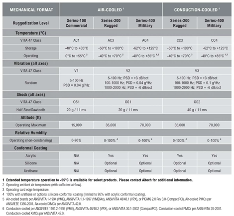 Aitech社の製品は、ラガダイゼーションのレベル(Commercial、Rugged、Super-rugged military)を定義しており、Air-cooled、Conduction-cooledの2種類のメカニカル/サーマル形式に対応しています。