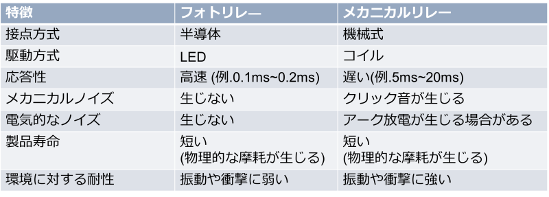 リレー製品の一種で、メカニカルリレーとの最大の違いは機械的な接点を持たない点にあります。そのため、フォトリレーにはメカニカルリレーと比較すると様々なメリットがあります。