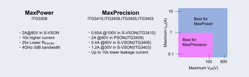 Integense社のPureOpto製品は大きく2つのカテゴリがあります。高耐圧と低いオン抵抗を特徴としたMaxPowerと低いリーク電流を特徴としたMaxPrecisionシリーズがあり、ご要望に応じてカスタムも承っております。
