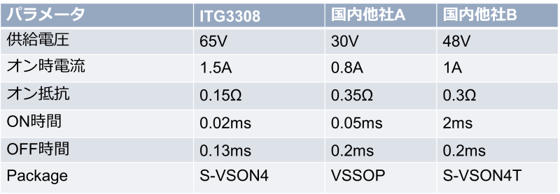 他社品と比較すると小型パッケージでありながら耐圧が高く、電流をより流せるなどの特徴があります。また、低ON抵抗品でありながら高速スイッチングを得意としています。