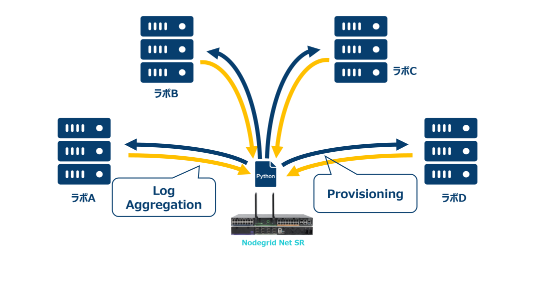 NodegridはPython、Bash、Ansibleなどとの自動化を統合するフレームワークを提供します。また、ポートあたり最大20,000行のバッファにより、長時間テストのログも完全に保持します。万が一の障害時には、統合されたOOBアクセス機能により、メインネットワークがダウンしていてもリモートから電源リサイクル(再起動)やトラブルシューティングが可能です。