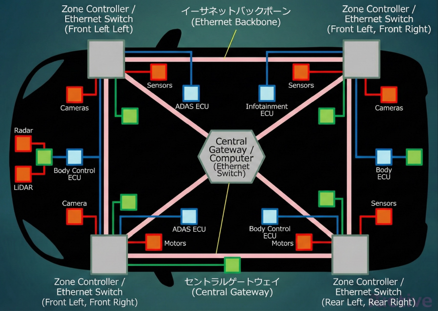 E/Eアーキテクチャの変革は、物理層テストに新たな難題を突きつけています。ゾーンアーキテクチャでは、車両の各「ゾーン(領域)」に配置されたゾーンコントローラー(ゲートウェイ)が、その領域内のセンサー、アクチュエータ、ECUを束ね、イーサネットバックボーンを介して中央のコンピューターと通信します1。