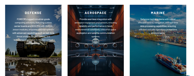 FORECR社が提供するNVIDIA社のJetsonシリーズCPUモジュールを搭載したAIエッジコンピュータはIP67に対応し、防水・防塵での利用を可能にします。その耐環境性能から防衛市場だけでなく、鉄道、農業機械、建設機械など屋外で使用される様々な設備においての利用を可能にします。特に防衛と鉄道市場向けにはその市場特有の規格も取得しており、スムーズな導入を可能にします。プロセッサはJetsonシリーズに特化し、AGX OrinからOrin Nanoまでお客様のニーズに合った製品を提供します。また、耐環境性コンピュータだけでなく通常のより安価な産業用コンピュータやシャーシを無くし、基板レベルで製品に組み込むことが可能な小型キャリアボードだけの提供も行っております。