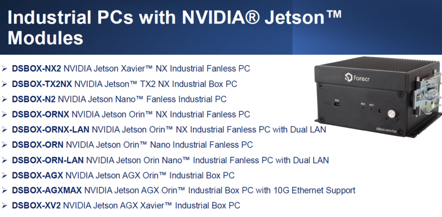 NVIDIA社のPreferredパートナーであるFORECR社は前世代であるJetsonXavier世代から豊富な製品開発を行い、現在AGX OrinからOrin Nanoまで豊富なプロセッサを搭載した製品ラインナップを用意しています。また最新の世代であるJetson Thor搭載製品についてもいち早く市場投入致しました。