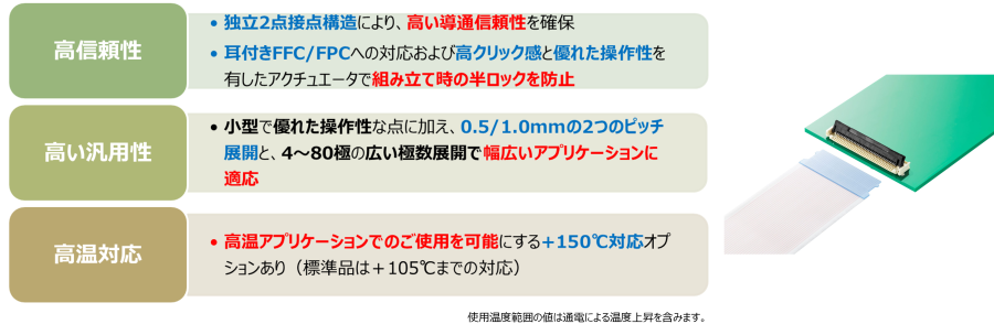 FFC/FPCコネクタを用いた接続は、各社の技術向上により小型化・狭ピッチ化が進んでいます。部品の小型化は基板の専有面積を削減し、装置自体の小型化に大きく寄与しますが、工場での組立性の低下を招きかねません。