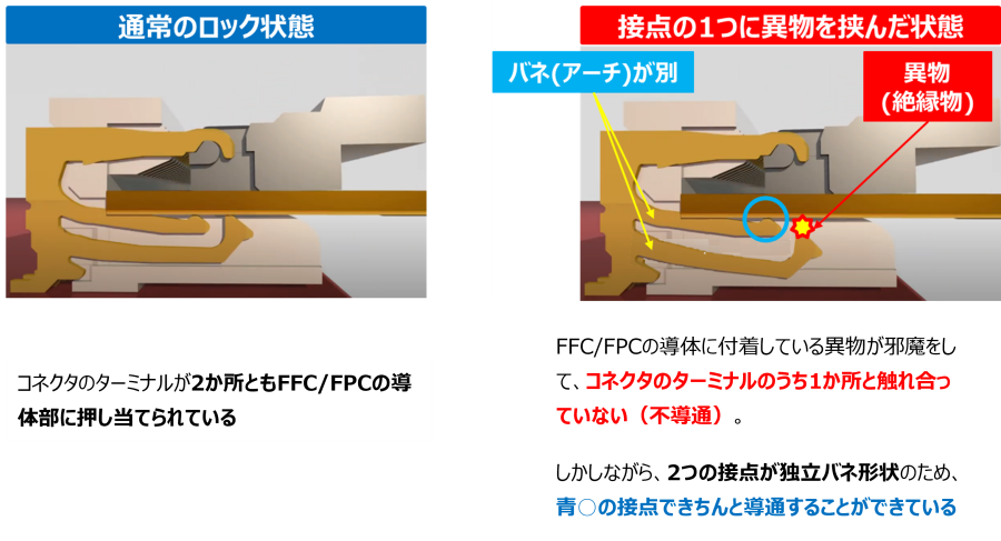 ⇒万一、接点上に異物(絶縁物)が載った状態で嵌合してしまうと、不導通につながる可能性がある