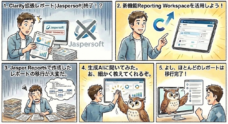 これまで長らく親しまれてきたJasperReports(拡張レポート)は、2026年9月のバージョン16.4.3をもってサポート終了(削除)が決定しています。一見すると大きな環境変化ですが、実はこれ、Clarity独自の新しいレポート機能や外部連携により直感的で高度なデータ活用を実現するための絶好の機会なのです。そして、円滑なユーザーの移行には「生成AI」が大きな役割を果たしてくれるでしょう。