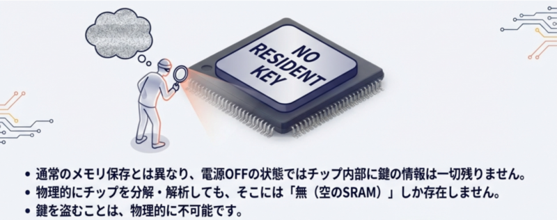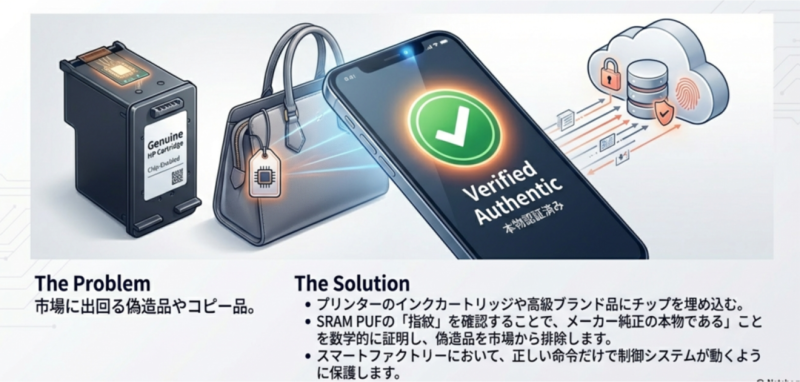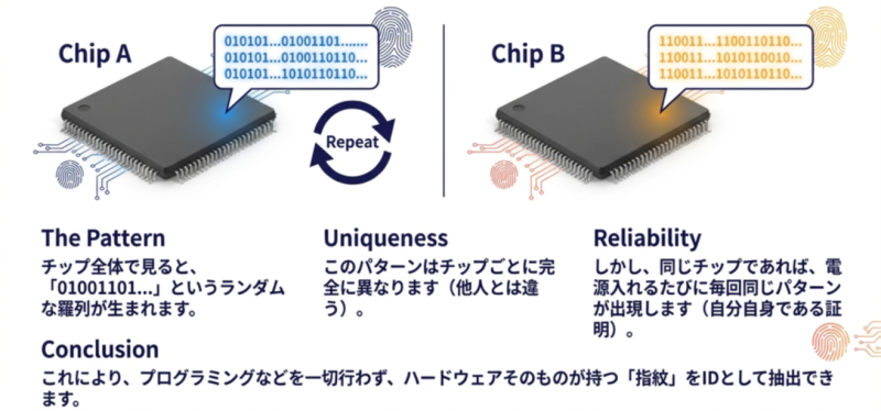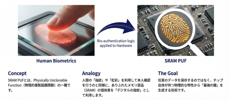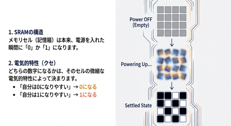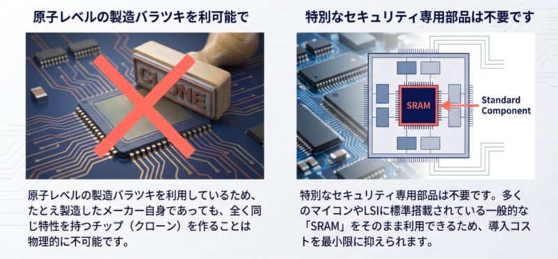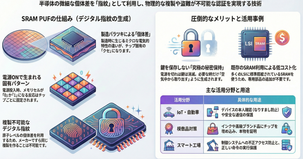 - 製造プロセスに起因するSRAMセルの微細な個体差を利用して、チップごとに固有の「デジタル指紋」を生成する技術です。