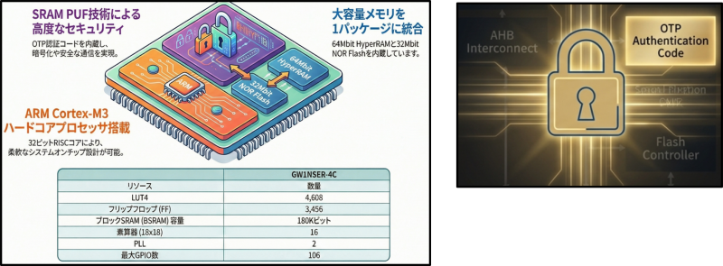 GW1NSERはSRAM PUF技術をベースとしたハードウェアレベルのセキュリティを基盤に、マイクロプロセッサ、FPGAファブリック、大容量メモリを統合した、セキュアなシステムインパッケージ(SiP)です。