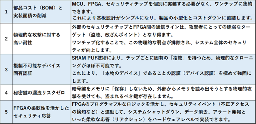 FPGAにPUFのような高度なセキュリティ機能を内蔵することには、従来の「FPGA + 外部セキュリティチップ」という構成にはない、以下のような大きなメリットがあります。