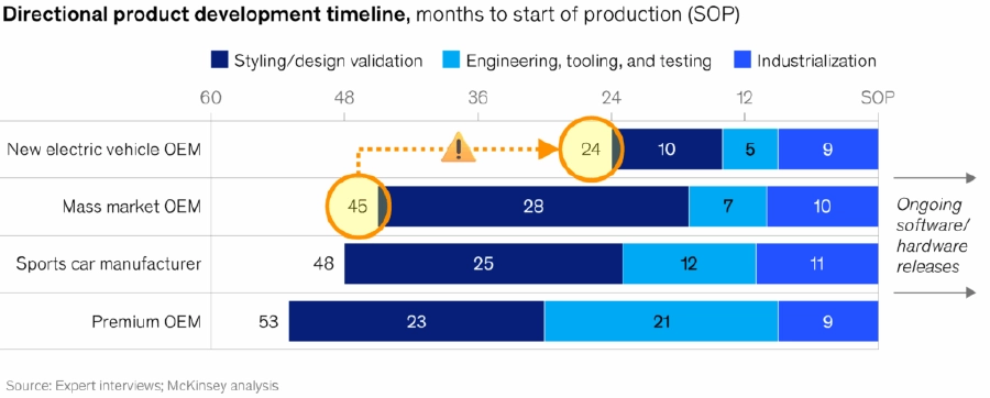 中国の新規電気自動車メーカーは、従来メーカーの2倍の速さで新型車両をコンセプトから量産段階へ移行させている。出典:McKinsey & Company。