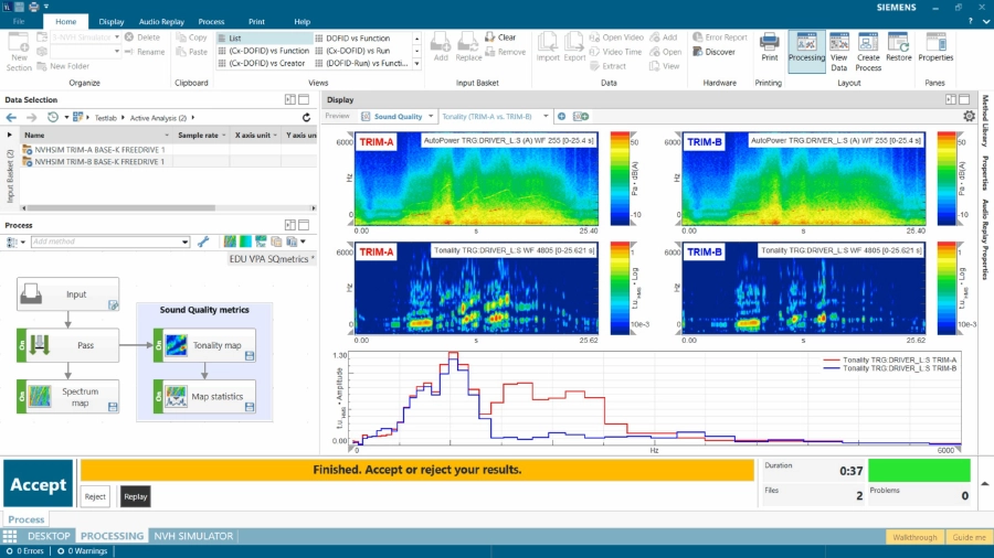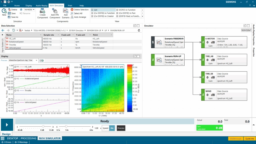 仮想車両トポロジーのNVH性能は、Simcenter Testlab NVHシミュレータにおいて、各NVHモデルに関連する運転条件を適用することで合成される。
