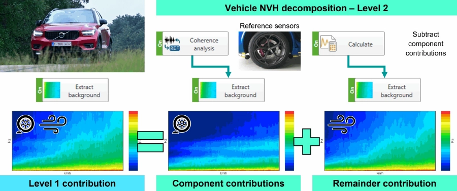 レベル2分解では、動作基準センサー信号を用いて相関フィルタリングにより車両全体のNVH特性を構成要素ごとの寄与度へ分解します。これは、より高度な計測努力を要する代わりに、詳細なNVHモデルを取得するための深層的な手法です。
