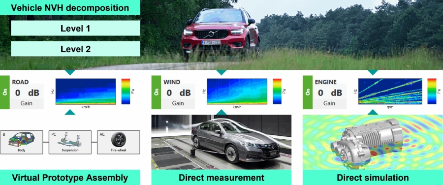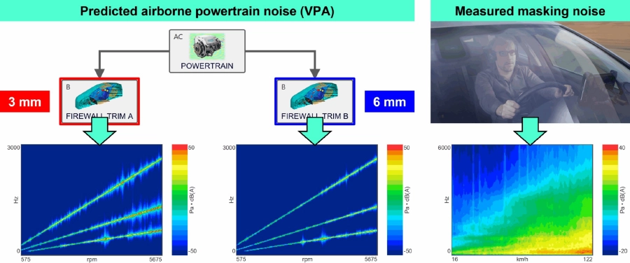 ボトムアップ方式のパワートレインNVHモデルは仮想プロトタイプ組立を用いて予測され、トップダウン方式のマスキングノイズNVHモデルは分解技術を用いてベンチマーク車両上で測定されました。