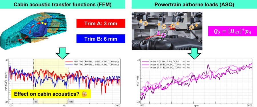 ファイアウォールトリム厚の選択肢を迅速に検討するため、ボディキャビティ有限要素モデルを用いて、各厚さ値におけるパワートレインの空気伝播負荷に対するキャビンの音響感度をシミュレーションしました。実際の空気伝播パワートレイン負荷は、関連する全運転条件において、試験台上で空気伝播音源定量化(ASQ)を用いて推定されました。