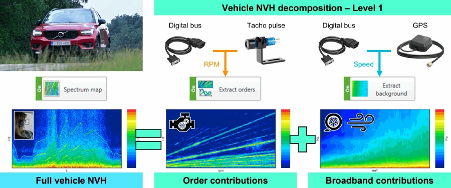 レベル1分解では、運転用RPM信号と車速信号を用いて、車両全体のNVH特性をパワートレイン固有振動数と広帯域背景騒音に分離します。これによって、計測機器の使用を最小限に抑えながら、粗いNVHモデルを迅速に取得できます。