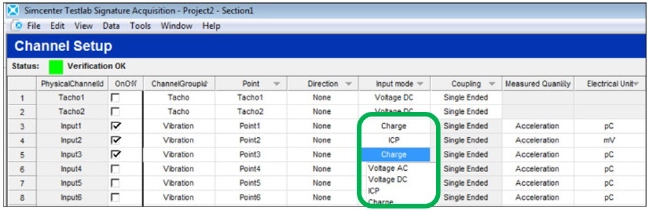 Simcenter Testlabは、適切なSCADASハードウェアが利用可能な場合に、このセクションで説明されているように電荷式加速度計を測定するように設定できます。電荷型加速度センサはICP加速度センサーとは異なる校正基準を有します:SCADASにVC8カードを装着後、Simcenter Testlabの「チャネル設定」ワークシートで「入力モード」プルダウンから「電荷」を選択します(図4)。