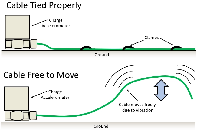 高振動環境で長いケーブルを使用する場合、ケーブルの動きを最小限に抑えるため、適切に固定することが重要です。電荷型加速度センサーなどの一部のトランスデューサは、ケーブルの動きのみによって局所的な静電容量変化を生じさせることがあります。これは振動データ上に実在しない大きなスパイクとして現れる可能性があります。これは摩擦起電力効果と呼ばれますが、「ケーブルのしなり」とも呼ばれることがあります。