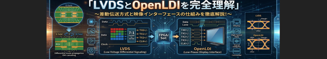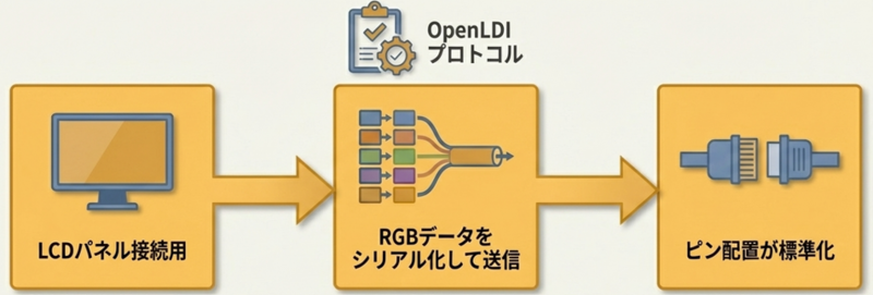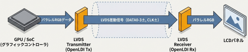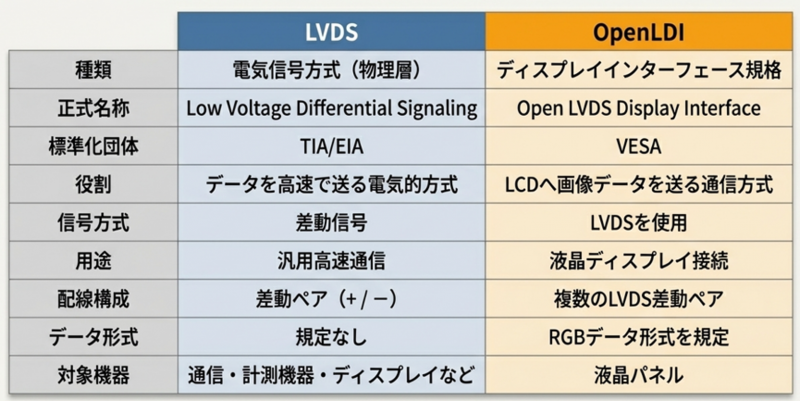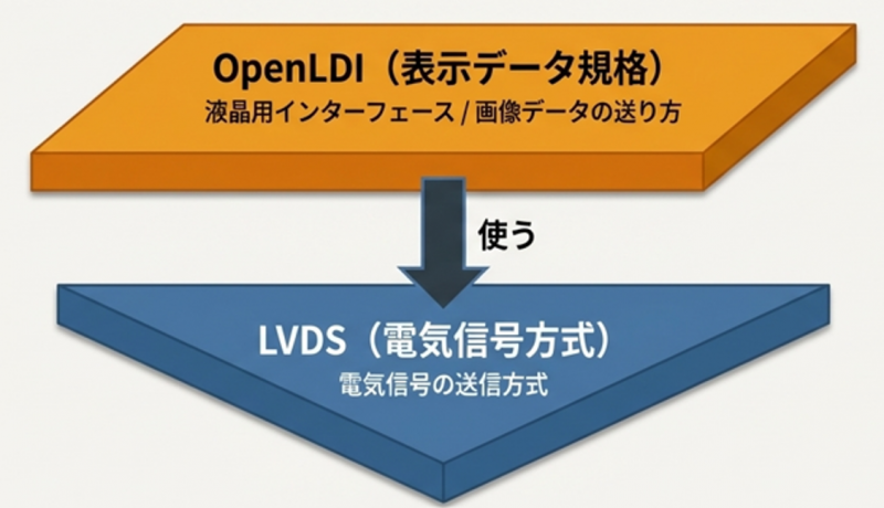 設計の現場で混同されがちですが、これらはレイヤー(階層)が異なります。画像データ形式を規定するのがOpenLDI、その電気的な運び方がLVDSです。