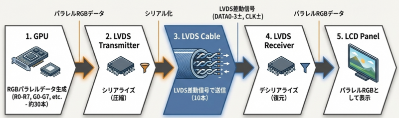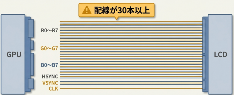 液晶パネルに画像データを送るには、RGBの各色、同期信号、クロックなど大量の信号が必要です。パラレル通信のままGPUからLCDへ接続すると、配線量が物理的・電気的なボトルネックになります。